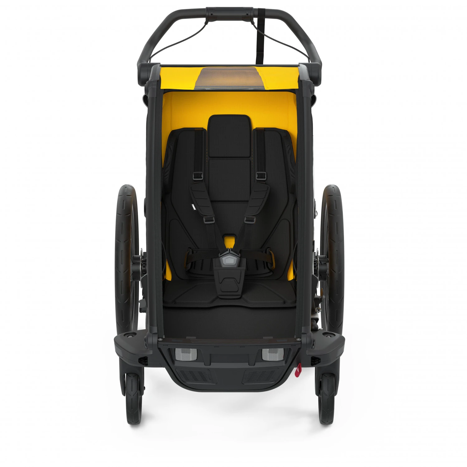 Der komfortabel gepolsterte Sitz des Chariot Sport 1 lässt sich für ein Nickerchen zum Liegesitz neigen, während die ganz ohne Werkzeuge einstellbare Federung unterwegs für ruhiges Fahrverhalten sorgt. Zum guten Innenraumklima tragen auch die herausnehmbaren Fenster bei.