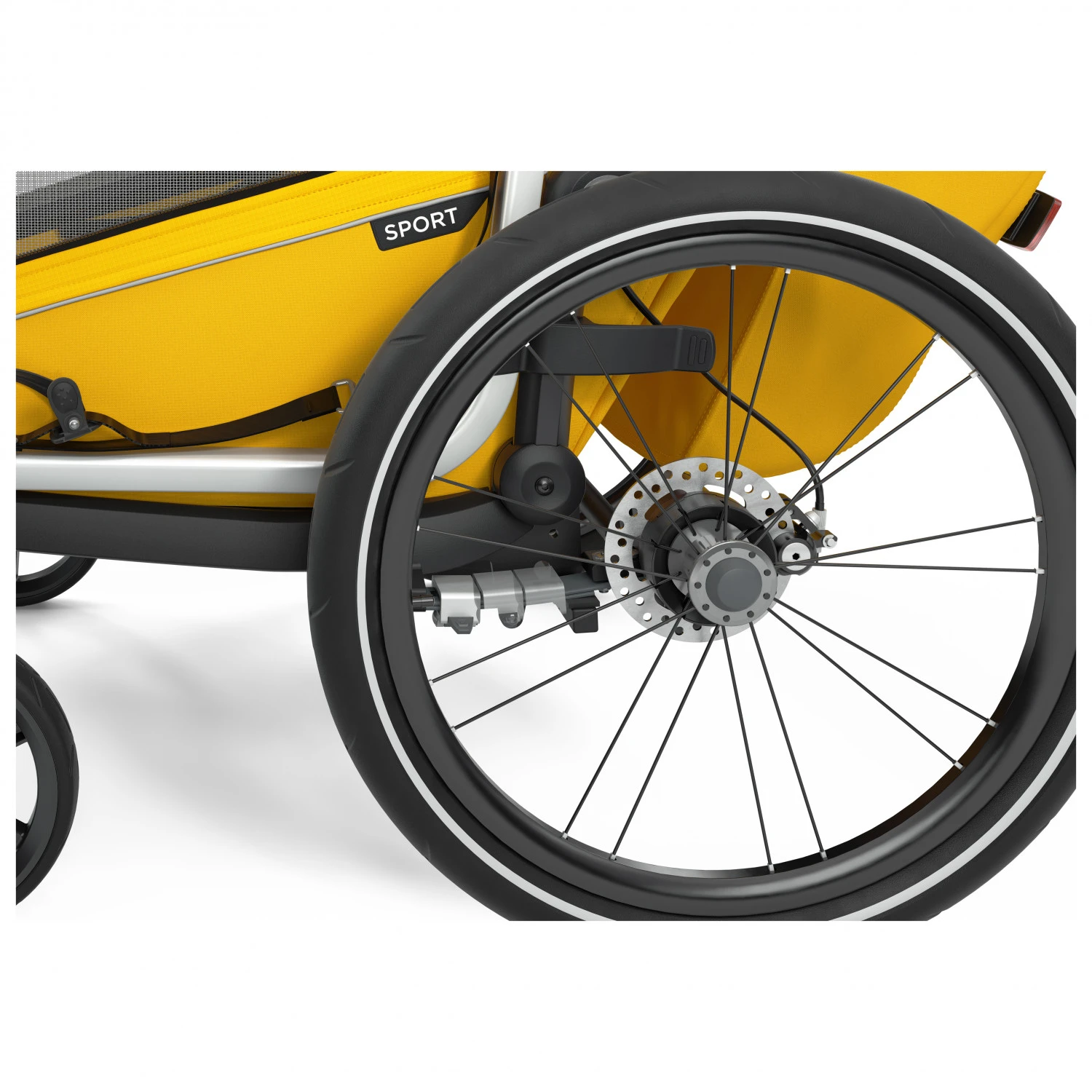 Den Wechsel zwischen Jogger-Buggy und Radanhänger vollzieht der Chariot Sport dank des im Lieferumfang enthaltenen Buggy-Sets schnell und einfach. Die beiden Systeme Thule Click n’ Store und Thule VersaWing machen das Ganze zu einer Sache von wenigen Handgriffen. Außerdem ist der ergonomische Schiebebügel für den „Buggy Modus“ verstellbar, sodass er sich beim Laufen in optimaler Greifposition befindet.