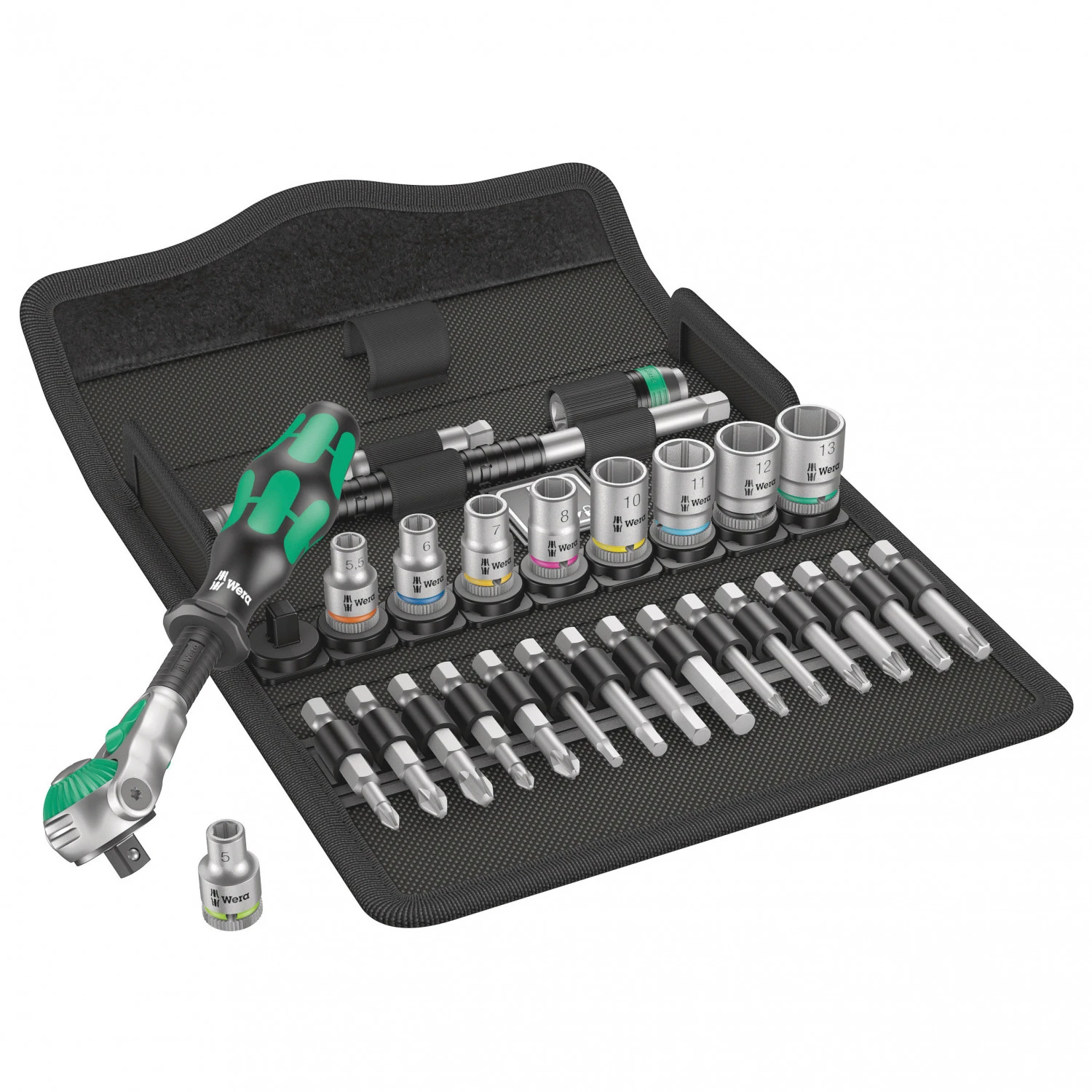 Der Wera Zyklop Speed-Ratsche 8100 SA 6 ist ein umfangreiches Werkzeug-Set in einer textilen Aufbewahrungstasche. Die Ratsche ist mit einem 1/4″ Vierkant-Antrieb ausgestattet und kann Vierkant-Steckschlüsseleinsätze und andere Verbindungsteile mit Vierkantantrieb und Kugelarretierung aufnehmen.